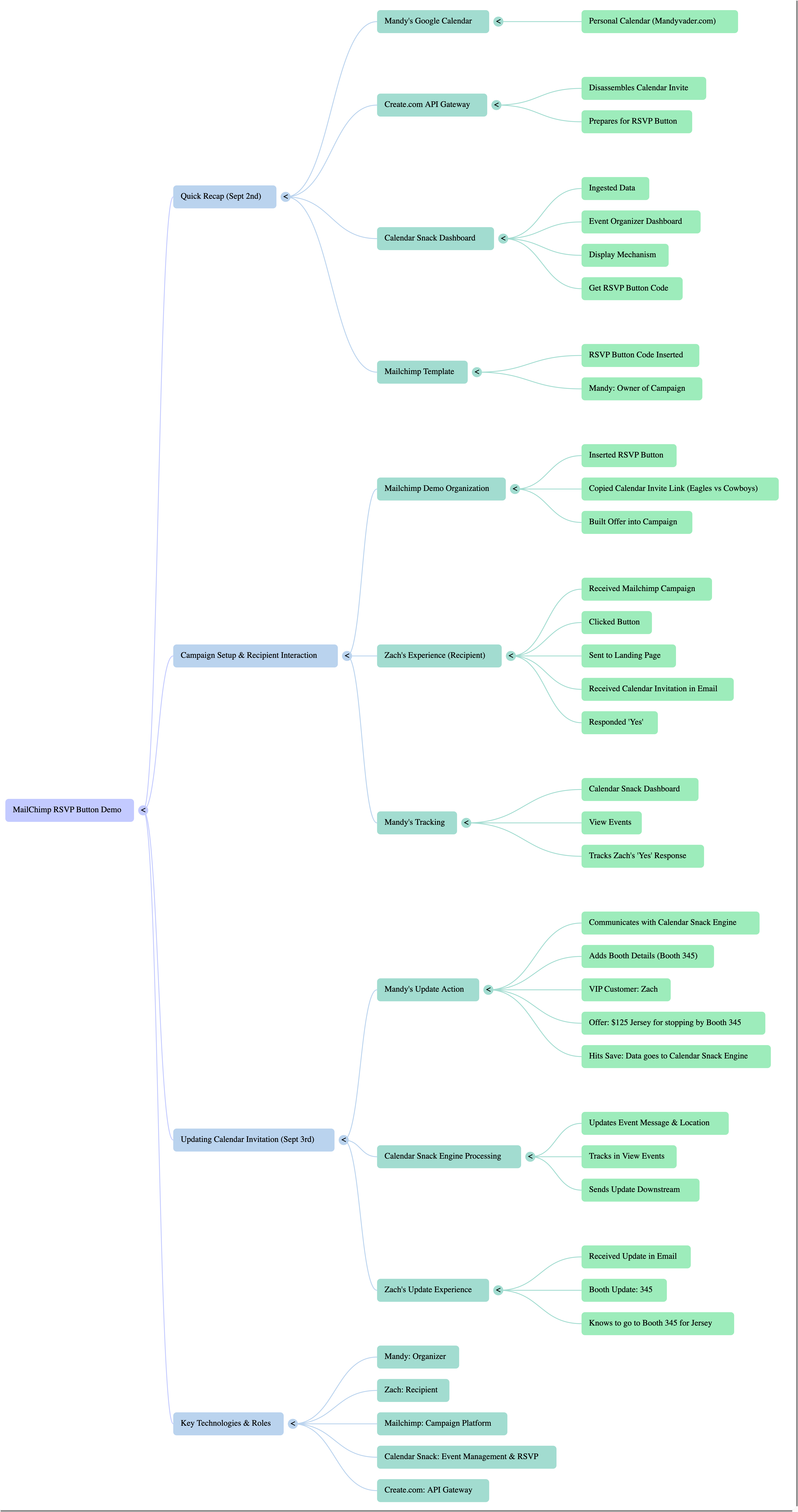 An organizer, such as Mandy in the demo, first creates an event on their personal calendar. This calendar invite is then sent to create.com, an API gateway that disassembles the invite. The data is ingested into the Calendar Snack dashboard, which serves as both the event organizer's dashboard and display mechanism. From this dashboard, the organizer can obtain the unique RSVP button code for their event. This code is then copied and inserted into their Mailchimp email template.